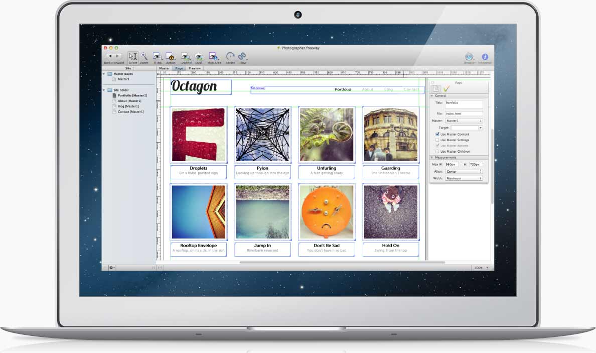 Freeway for Mac was developed to make designing sophisticated and standards-based websites easy. With a streamlined interface that’s just like using your favorite image editing applications, we made it easy for you to create HTML content without having to touch a line of code.